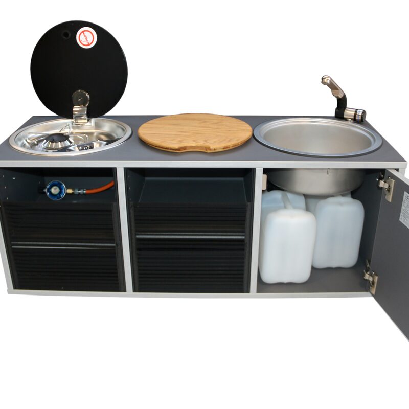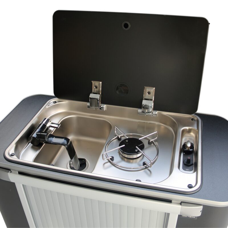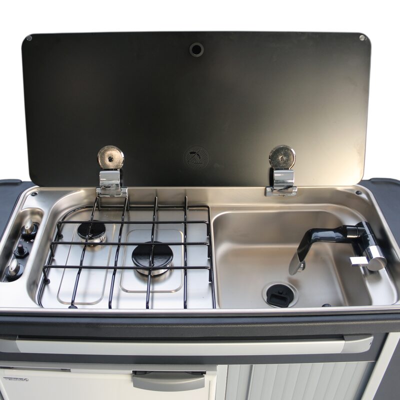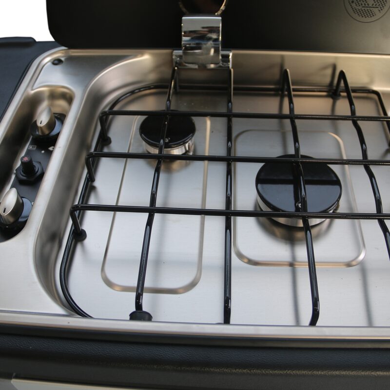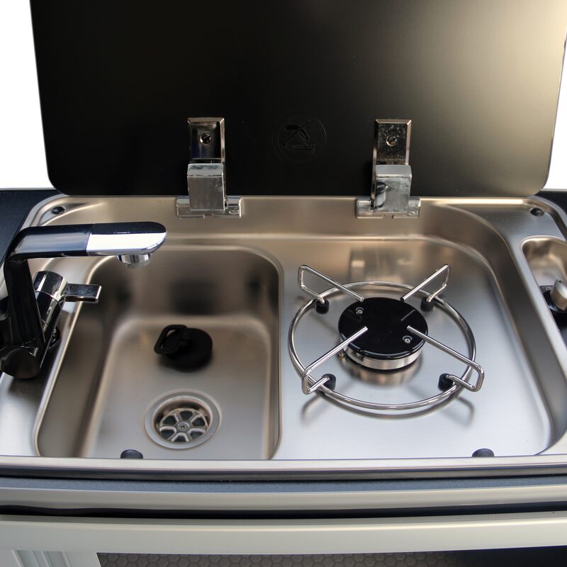 Mit separaten Abdeckungen aus temperaturbeständigem Sicherheitsglas und Bohrung für Wasserhahn (ø 33 mm) Mit Sicherheitszündsystem und elektronischer Zündung (Anschlussspannung 12 Volt wird benötigt).